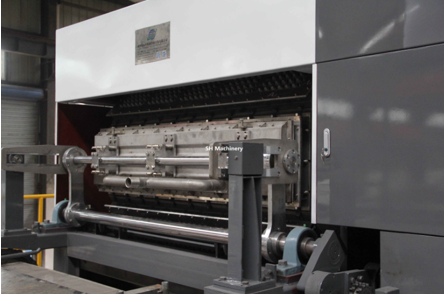 模塑制品的成型可以用上述三种制作方法之一来实现,应尽可能采用联合的方法以提高生产效率。制件的成型在与制件形状相应的模型上进行,模型由具有大量的孔、切口或网眼等通道的网,紧紧张在刚性构架上而制成。在排水的同时,模型的表面上将沉积纸浆纤维。模型外面或内面均可作为成型表面,紧贴着网的制件的表面应较平整和均匀一致,在制件成型时就要考虑到这一点。对于平面制品(桶盖、桶底、箱盖、折叠式纸箱的纸板材料等)的成型,可以用在压力下工作的装置来实现。这种装置就是一台挤压机,其中安装有紧张在刚性构架上的网构成的模型,向其罩壳中的网状模型上灌注浓度为2%-3%的经过计量的纤维浆液,然后伸进挤压冲头。挤压冲头可紧密地进入网状模型(下模)中,依靠挤压冲头的压力,在浆液槽中通过网眼进行强烈的过滤,水通过管道排出槽外,整个延伸下的挤压冲头,在压实成型了制件之后收缩,又回到了原始位置。而制品则借助于摘取器从模型上取下,转到烘干和下道工序上去。对于立体形状的制品的成型,一般使用较复杂的装置,这种制品在大多数情况下用真空法成型。