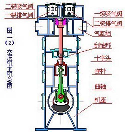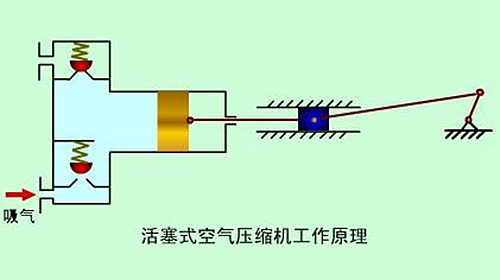活塞式空气压缩机的工作原理:活塞式空压机在气缸内作往复运动的活塞向右移动时,气缸内活塞左腔的压力低于大气压力,吸气阀开启,外界空气吸入缸内,这个过程称为压缩过程。当缸内压力高于输出空气管道内压力后,排气阀打开。活塞的往复运动是由电动机带动的曲柄滑块机构形成的。曲柄的旋运动转换为滑动--活塞的往复运动。这种结构的压缩机在排气过程结束时总有剩余容积存在。在下一次吸气时,剩余容积内的压缩空气会膨胀,从而减少了吸入的空气量,降低了效率,增加了压缩功。