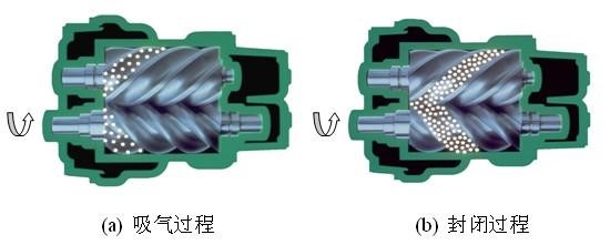 螺杆式空气压缩机的工作原理:电机驱动转子,主从转子的齿沟空间在转至进气端壁开口时,其空间大,外界的空气充满其中,当转子的进气侧端面转离了壳之进气口时,在齿沟间的空气被封闭在主、从转子与机壳之间,完成吸气过程。在吸气结束时,主、从转子齿峰与机壳形成的封闭容积随着转子角度的变化而减少,并按螺旋状移动,此为压缩过程。在输送过程中,容积不断减少,气体不断被压缩,压力提高,温度升高,同时,因气压差而变成雾状的润滑油被喷入压缩腔,从而达到压缩、降低温度密封和润滑的作用。当转子之封闭齿峰旋转到与机壳排气口相遇时,被压缩的空气开始排放,直到齿峰与齿沟的吻合面移至排气端面,此时齿沟空间为零,即完成排气过程。与此同时,主从转子的另一对齿沟已旋转至进气端,形成大空间,开始吸气过程,由此开始一个新的压缩循环。